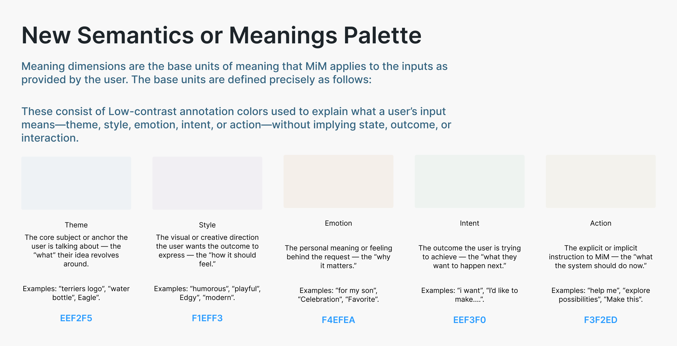 - Outputs: The creative directions, layouts, product mockups, or suggestions and such that MiM returns after processing.
